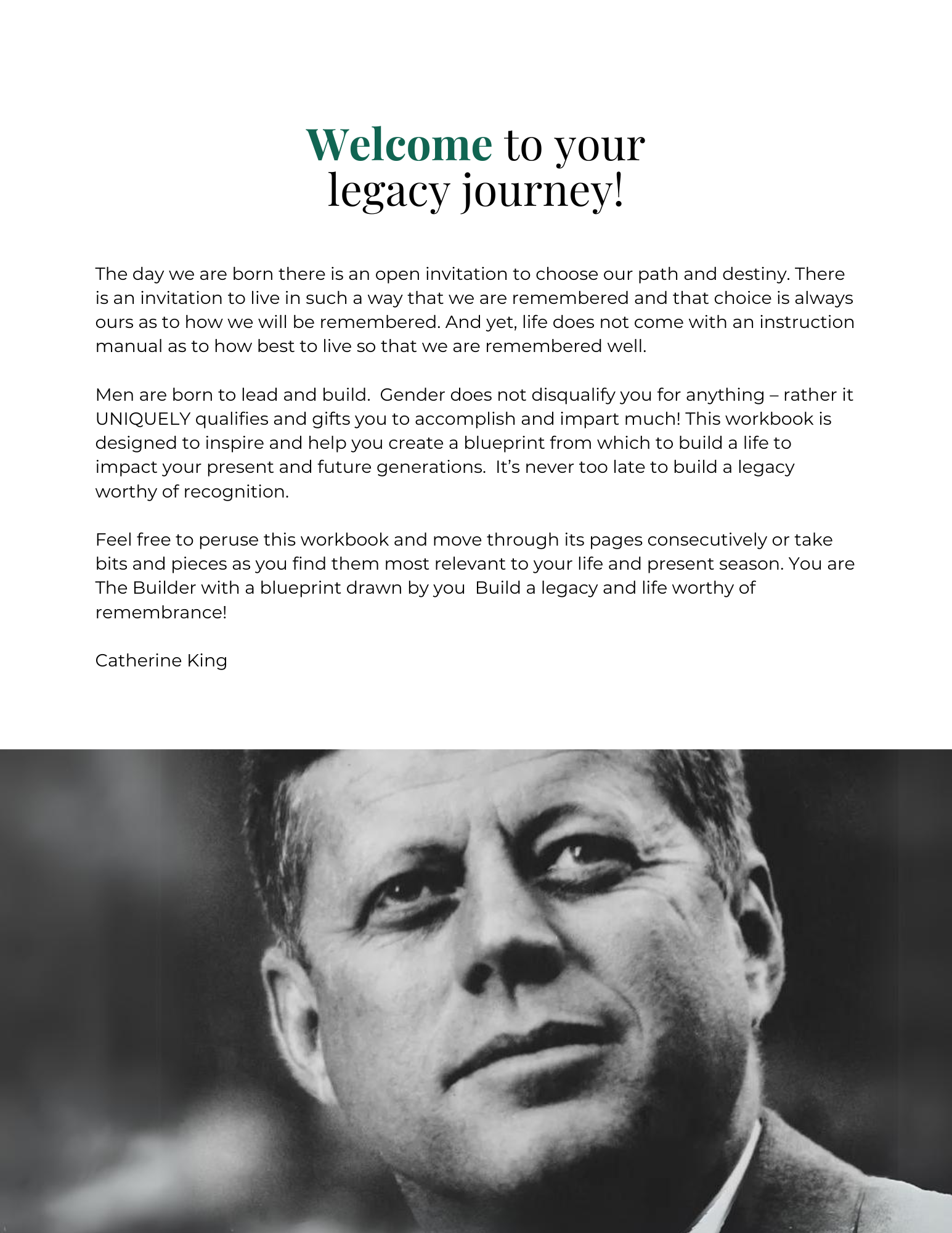Welcome, Builder. This transformative workbook is your key to crafting a life of purpose, impact, and legacy that echoes through time. Within these pages, guided by the insights of Catherine King, you'll embark on a journey of self-discovery and empowerment, unearthing your unique potential and sculpting a roadmap for lasting influence.